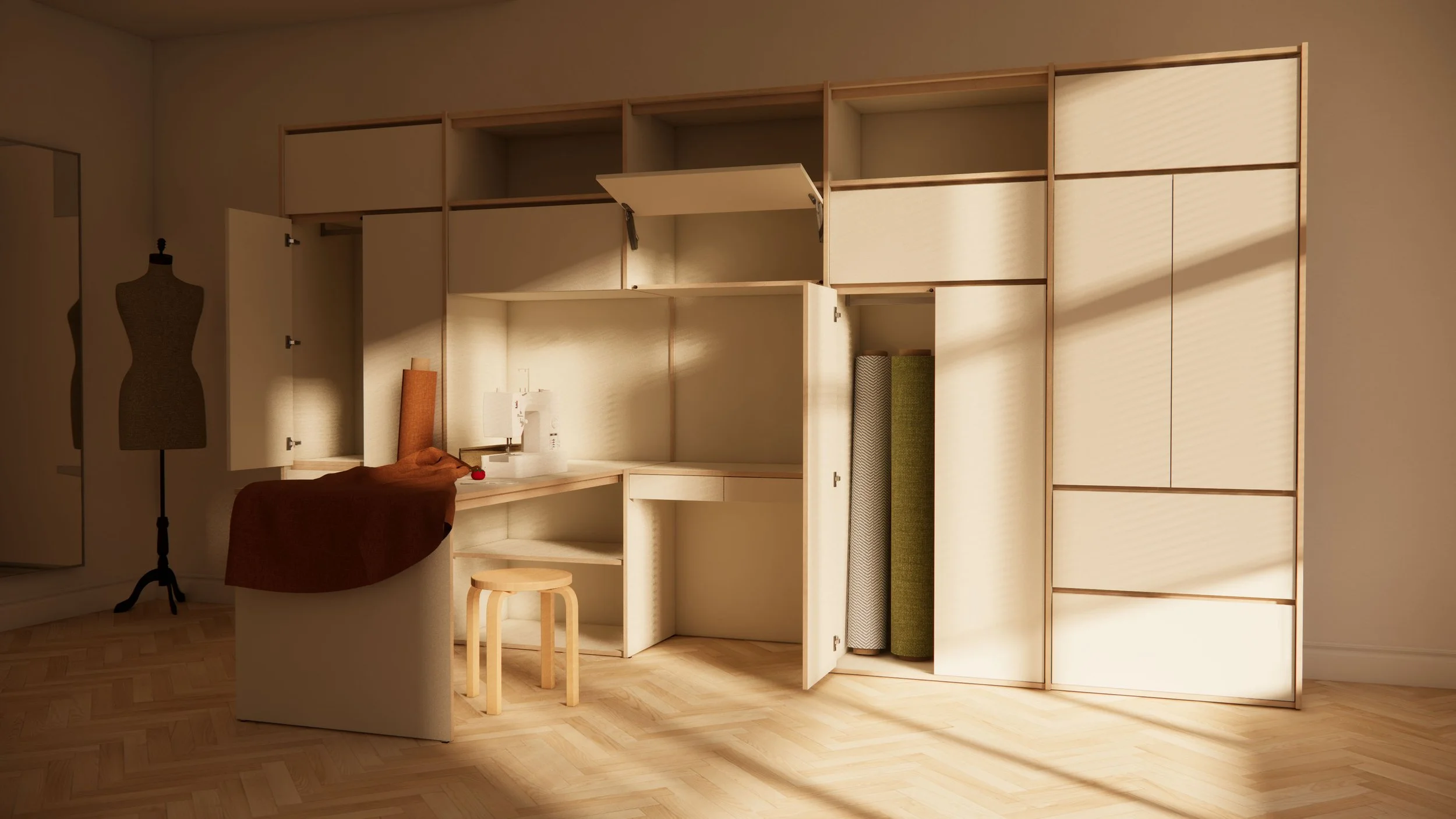 Integration. Architectural casework is designed to work across functions and across rooms. A wardrobe, a home office, and a media wall conceived within the same system share a material language, a dimensional logic, and a visual coherence that standard cabinetry - specified piece by piece from different ranges - rarely achieves.