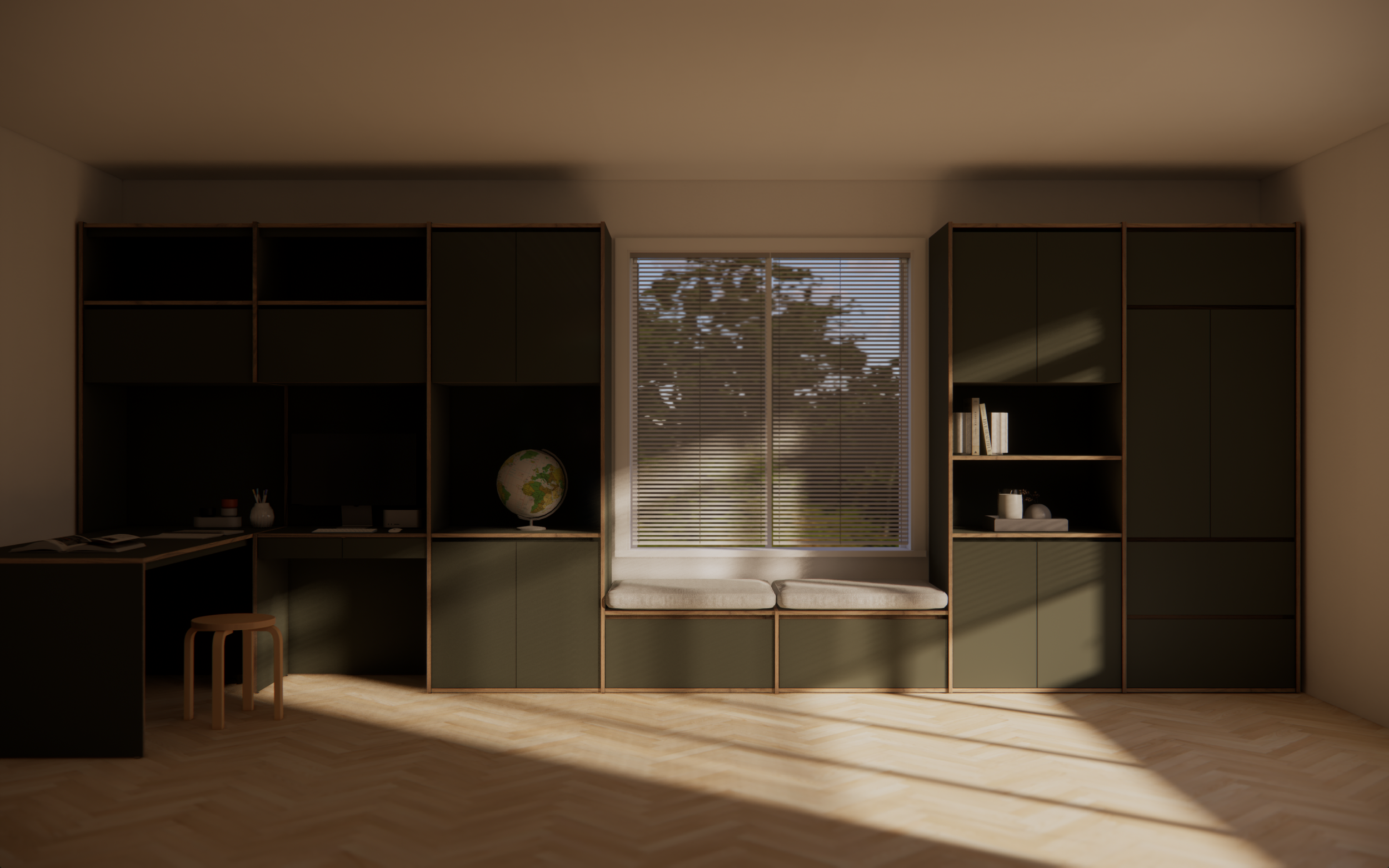 A multi-functional Tekka fully outfitted across the wall, offering work space, storage, and a reading nook.