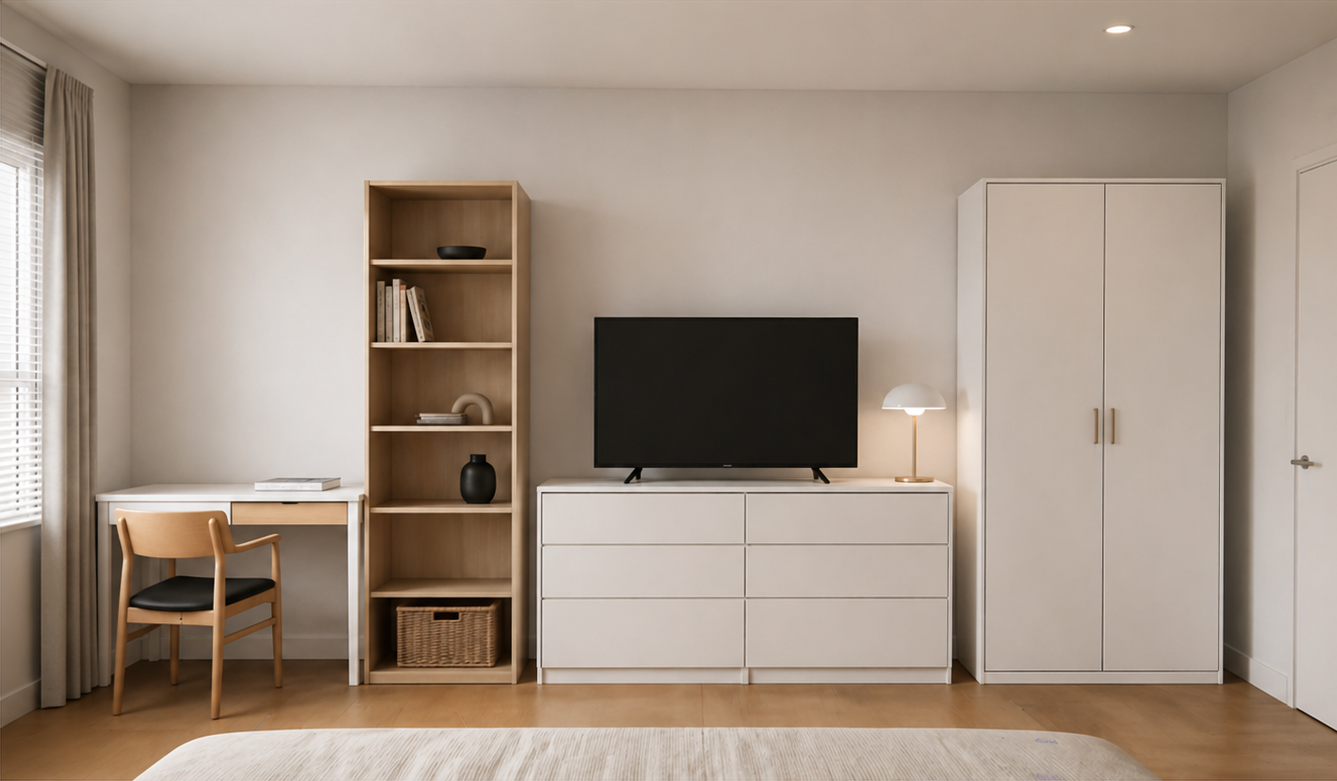 Off-the-shelf furniture pieces come in standard dimensions, resulting inefficient uses of space and hard to clean gaps