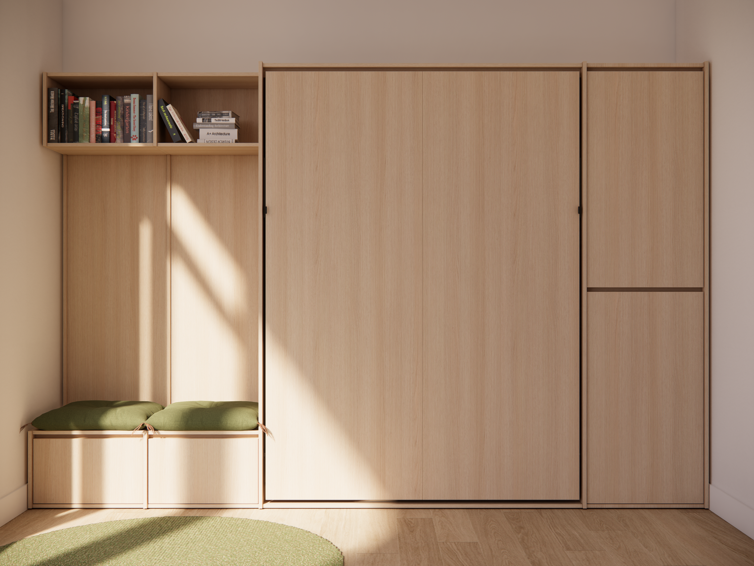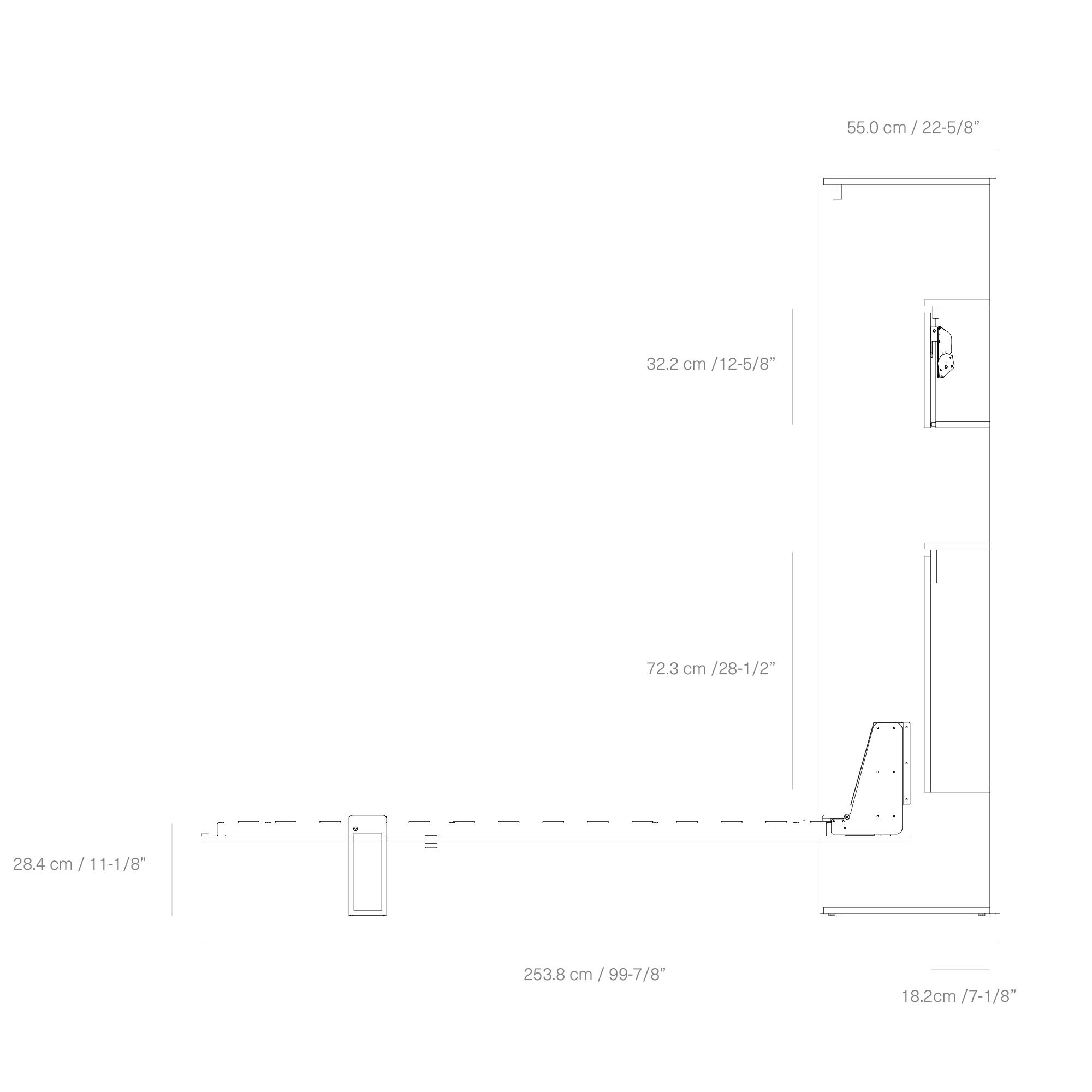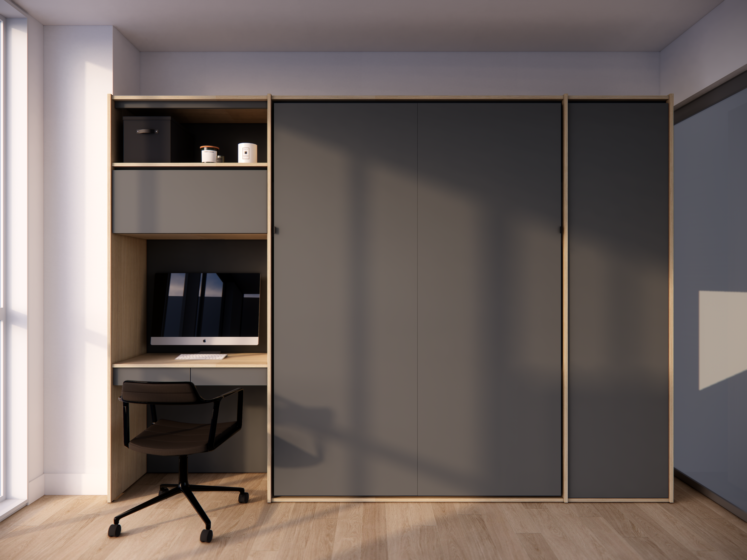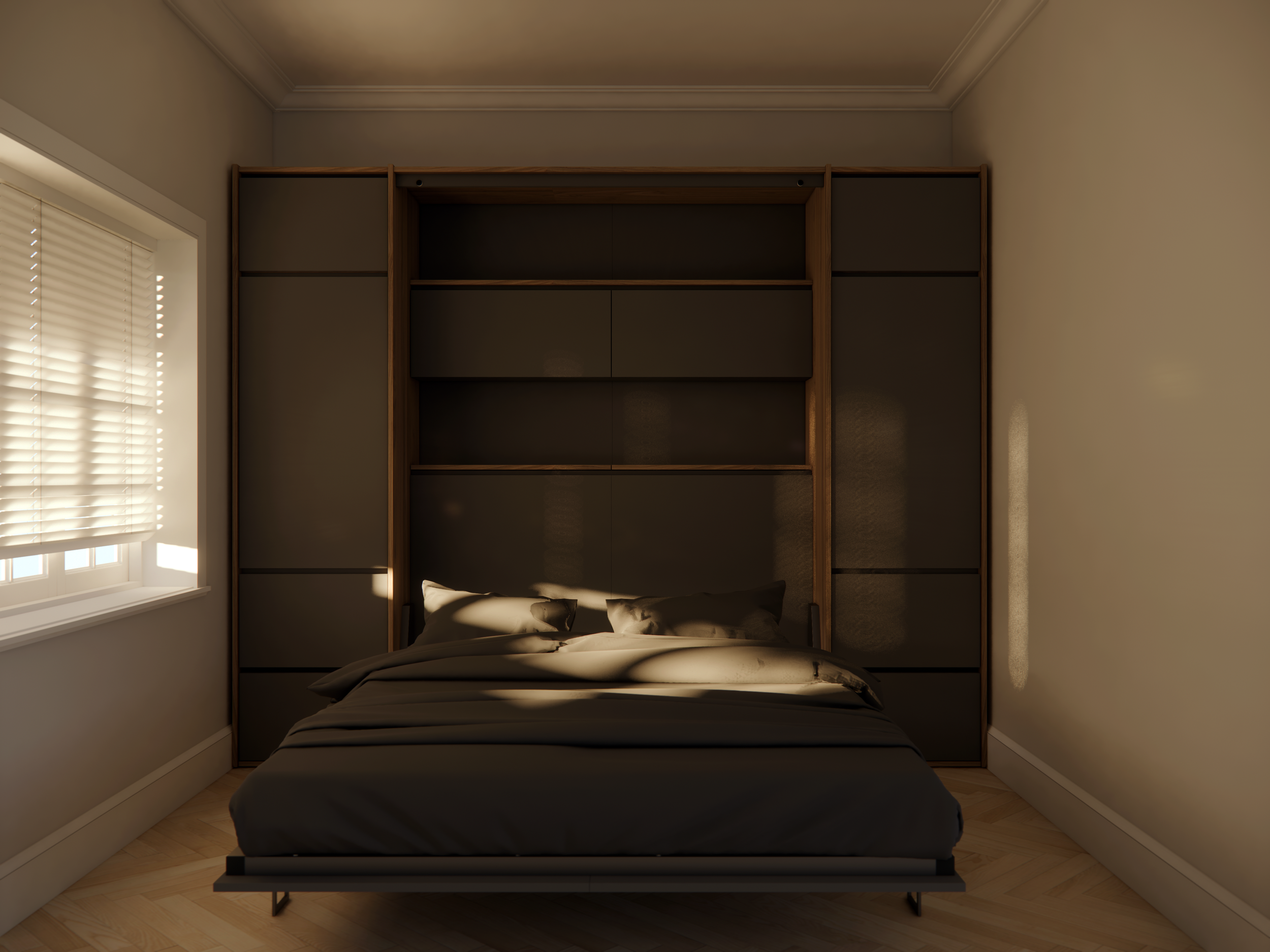 Building on the compact elegance of the original, EDDY 55 offers added depth and utility with a 55 cm / 21-5/8 inprofile. Designed with an integrated headboard storage and a lift-up cabinet, it provides space for bedding, books, or daily essentials while maintaining a seamless façade. Pair it with any 55 furniture for maximum storage retreat.