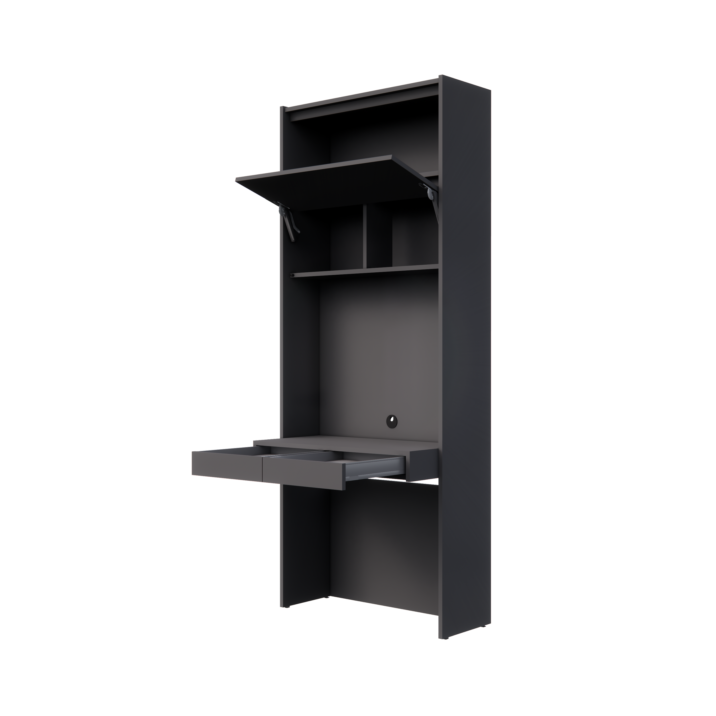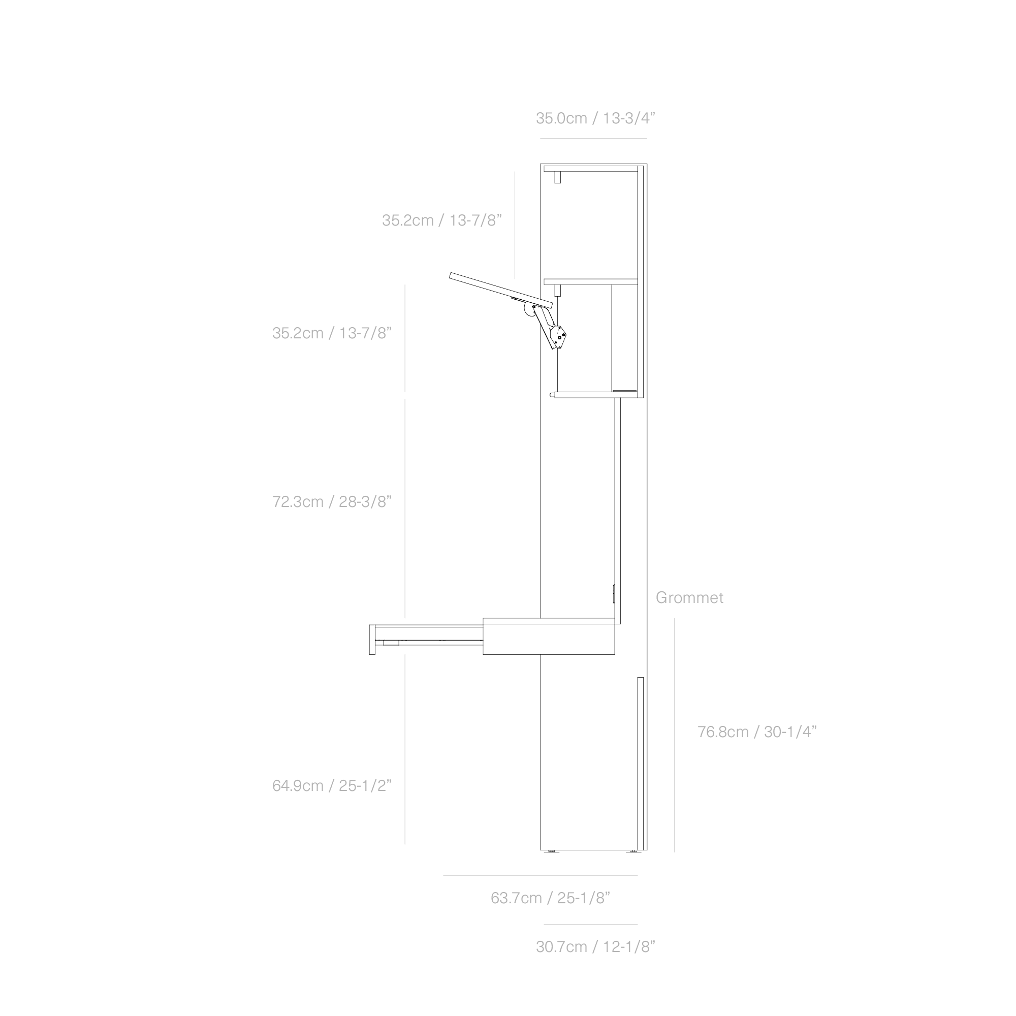HOMEWORK 35 is a deep desk unit designed for productivity and heavy-duty use. With a desktop depth of 43.2 cm, it offers ample space for large monitors, full workstations, or creative setups that demand room to move. Two integrated pencil drawers keep everyday essentials close at hand, while a built-in wire chase behind the desk connects seamlessly to the upper cabinet for clean, concealed cable management. Functional and refined, HOMEWORK 35 brings order and efficiency to compact work environments.