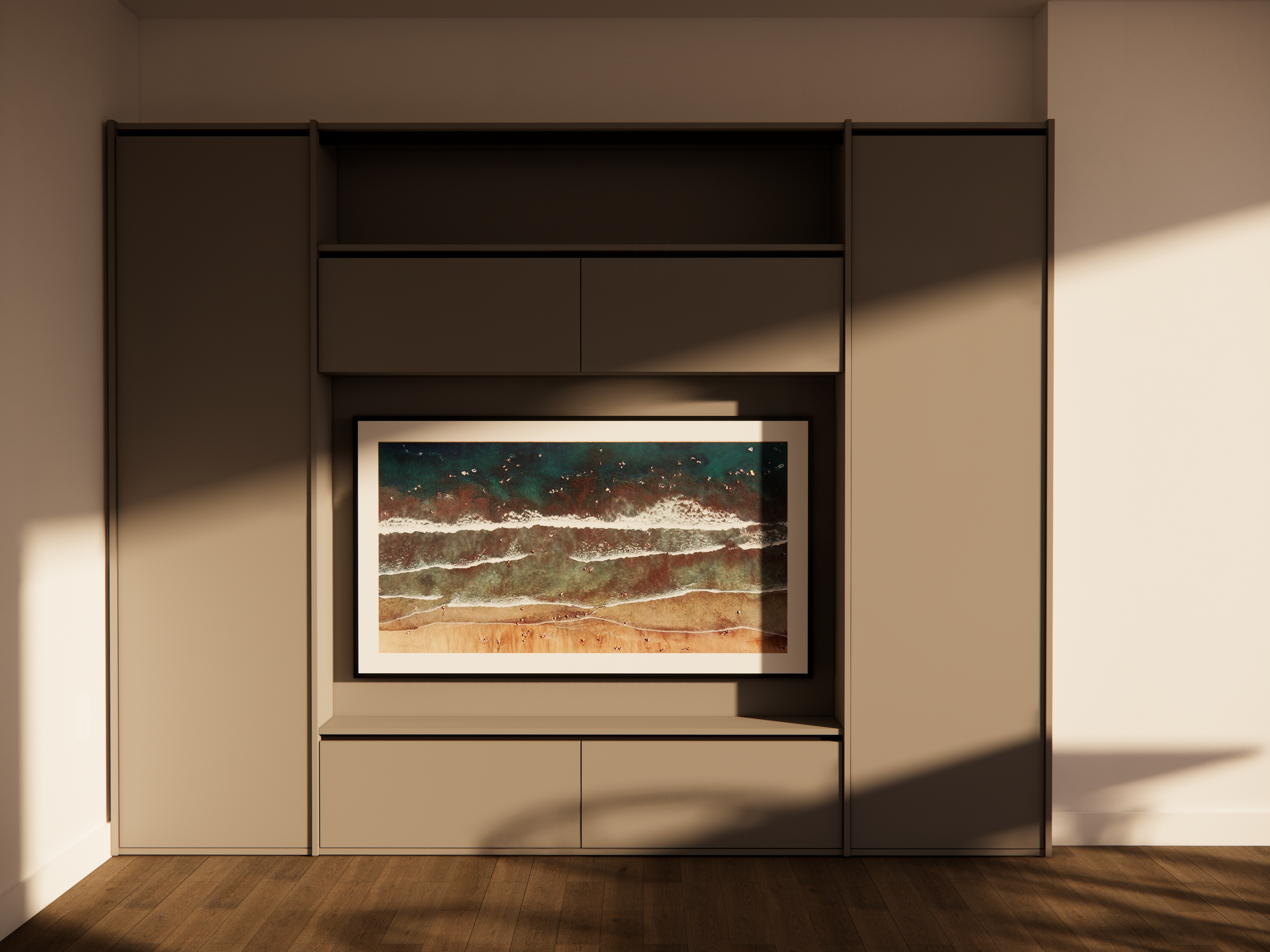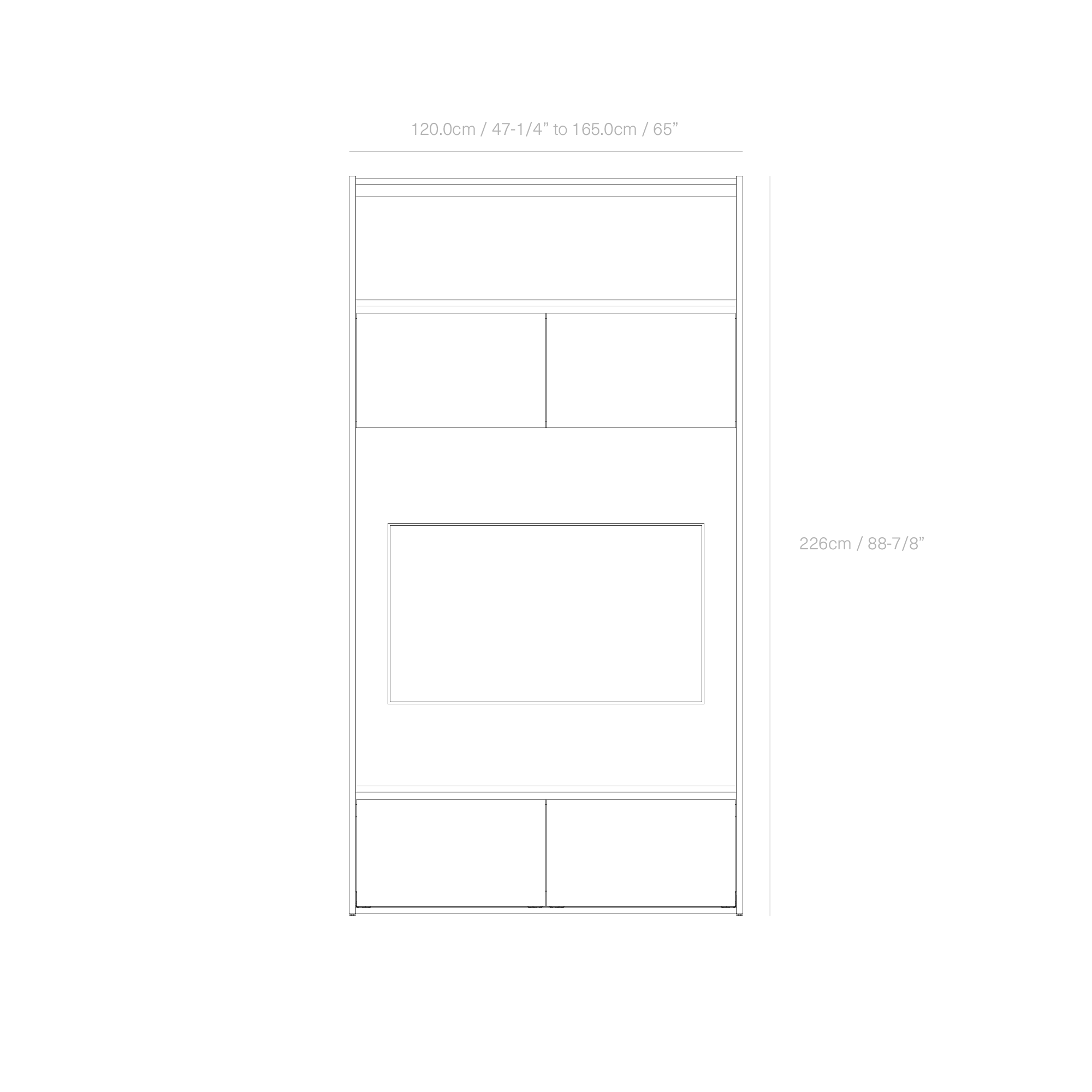 WATCH 35 is a versatile media unit that accommodates up to a 65" TV, offering both storage and display options. Two spacious drawers below provide room for media accessories, while the upper section features open shelves and lift-up cabinets for additional storage. Behind the lift-up cabinets, cables can be conveniently routed down to the TV and drawers, allowing for an organized and streamlined setup.