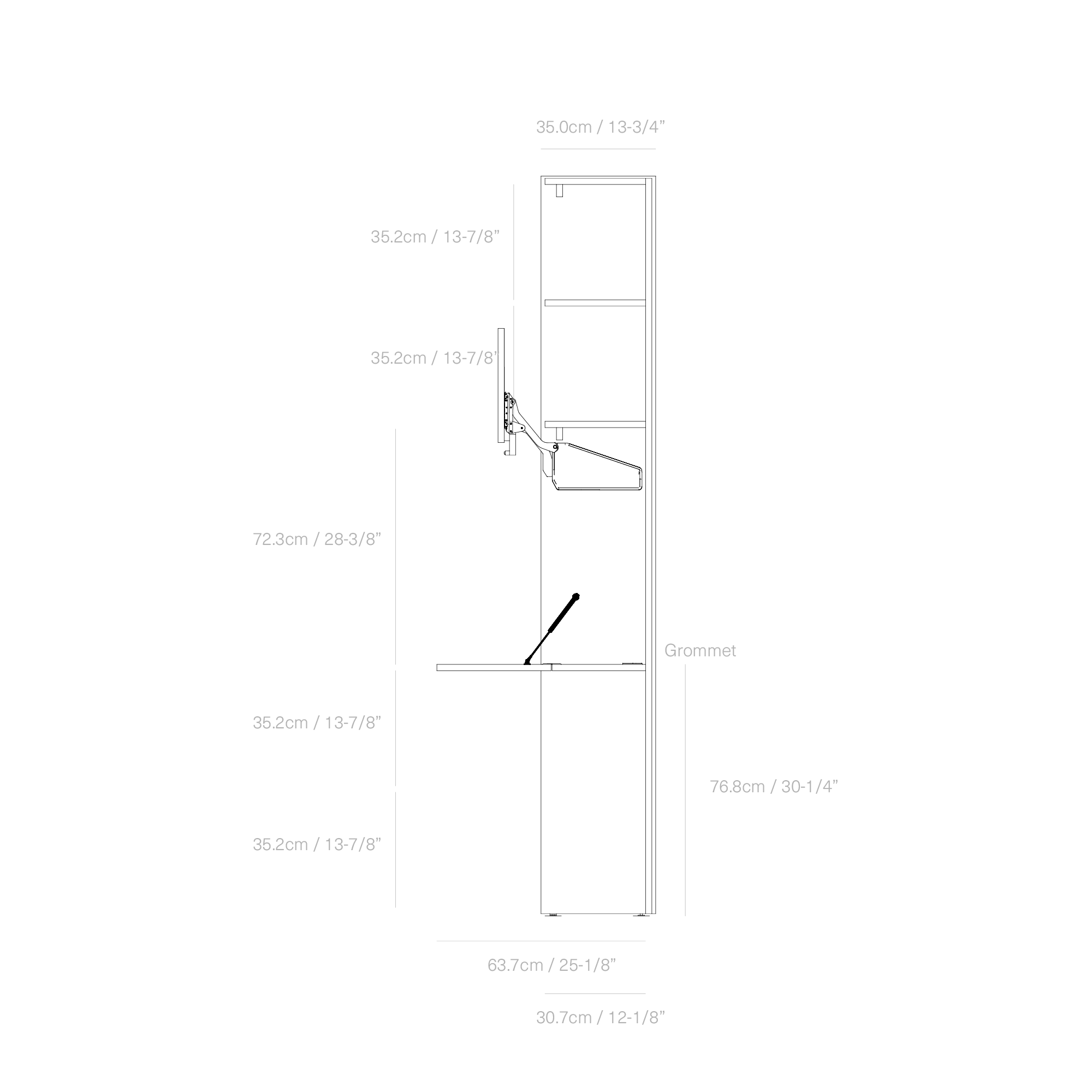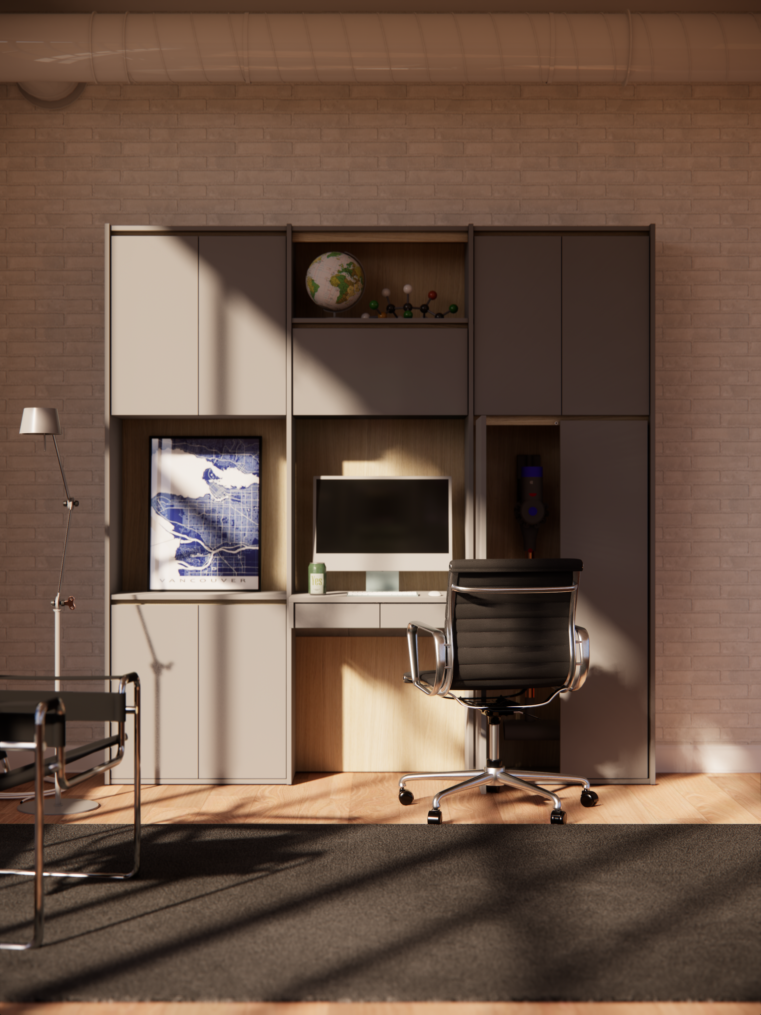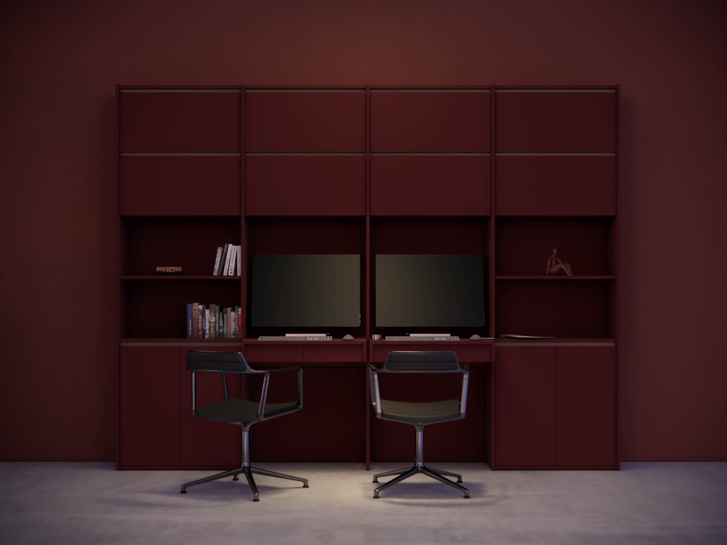 WORK 35 is a deep desk unit designed for productivity and heavy-duty use. With a desktop depth of 43.2 cm, it offers ample space for large monitors, full workstations, or creative setups that demand room to move. Two integrated pencil drawers keep everyday essentials close at hand, while a built-in wire chase behind the desk connects seamlessly to the upper cabinet for clean, concealed cable management. Functional and refined, WORK 35 brings order and efficiency to compact work environments.